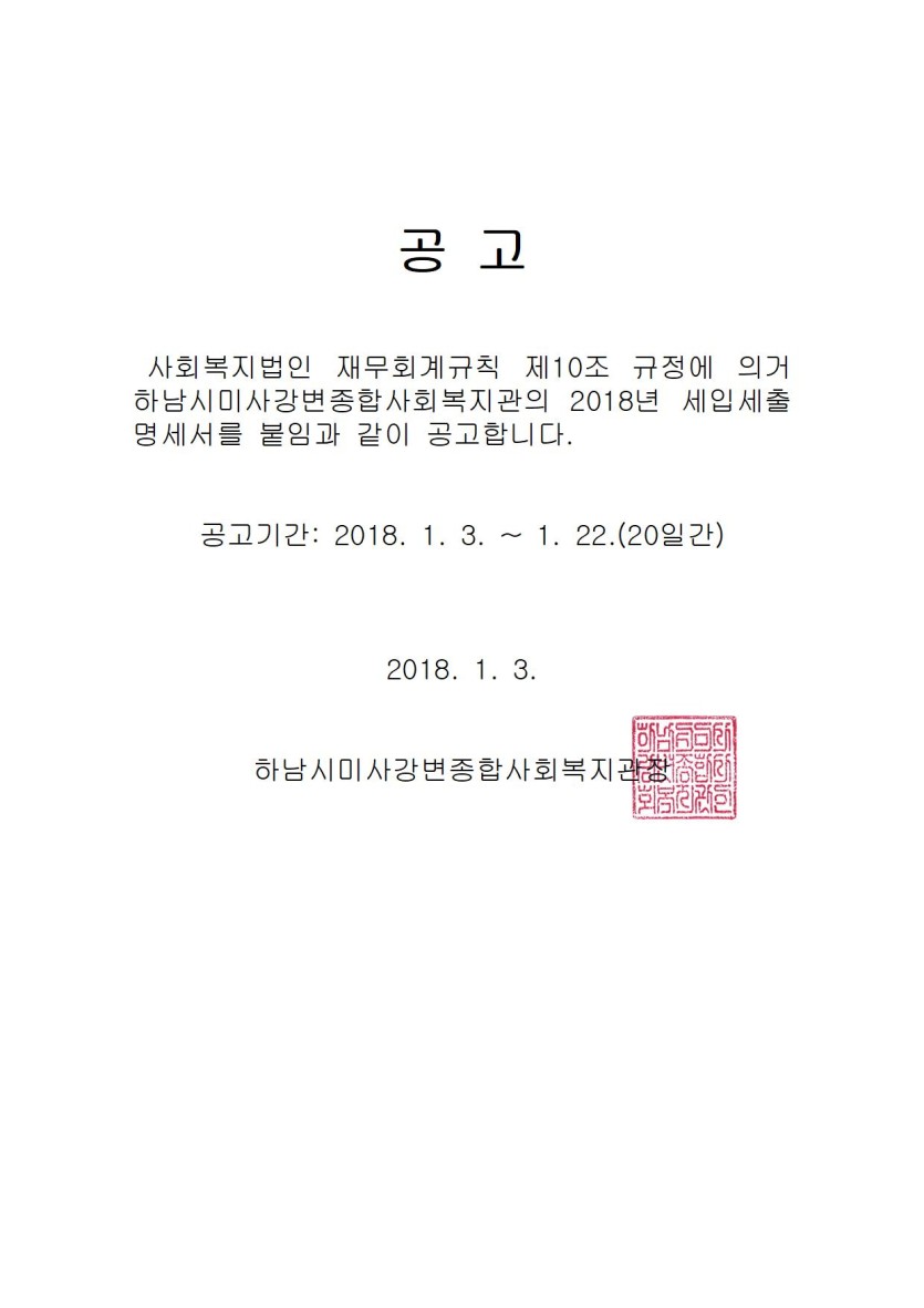 사회복지법인 재무회계규칙 제10조 규정에 의거 하남시미사강변종합사회복지관의 2017년 세입세출명세서를 붙임과 같이 공고합니다.