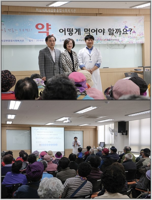 하남시약사회(회장 이현수)·하남시보건소(소장 구성수)·하남시미사강변종합사회복지관(관장 조혜연) 이 함께하는 건강한 마을 만들기 프로젝트(약, 어떻게 먹어야 할까요?) 사업이 2018년 4월 13일 첫 번째 교육으로 어르신 60여명이 참석한 가운데 이호석 약사(미사보룡약국)의 <그것이 알고 싶다. 약> 주제로 사업의 시작을 알렸습니다.