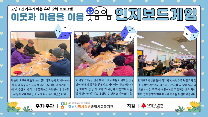 2025년 웃음이음-인지보드게입 11회기 진행 게시글 작성정보 작성자 관리자 작성일 25-11-20 16:00 조회수 10 댓글수 0 목록 게시글 본문 웃음이음 인지보드게임 11회기 진행 첨부파일 2개 웃음이음_통합예술치료프로그램 11회기_홈페이지시안 2.png (6.6M) 0회 다운로드 첨부일시 : 2025-11-20 16:00:00 웃음이음_통합예술치료프로그램 11회기_홈페이지시안 1.png (6.5M) 0회 다운로드 첨부일시 : 2025-11-20 16:00:00 이전글 11월 어르신 생신잔치 25-11-26 다음글 준오헤어 하남스타필드점과 함께하는 11월의 헤어조이 25-11-19 댓글 0 등록된 댓글이 없습니다. 목록