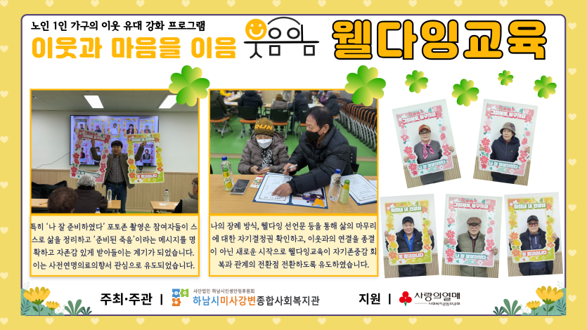 2025년 웃음이음-웰다잉교육 5회기 진행 게시글 작성정보 작성자 관리자 작성일 25-12-18 16:00 조회수 20 댓글수 0 목록 게시글 본문 웃음이음 웰다잉교육 5회기 진행 첨부파일 2개 2025웃음이음_웰다잉교육 1.png (6.4M) 0회 다운로드 첨부일시 : 2025-12-18 16:00:00 2025웃음이음_웰다잉교육 2.png (7.0M) 0회 다운로드 첨부일시 : 2025-12-18 16:00:00 이전글 2025년 웃음이음 종강식 진행 25-12-18 다음글 2025 성인문해교육 지원사업 배움학교 60~65회기 진행 25-12-16 댓글 0 등록된 댓글이 없습니다. 목록