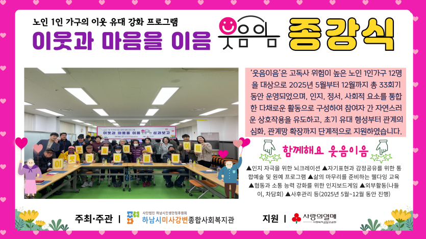 2025년 웃음이음 종강식 진행 게시글 작성정보 작성자 관리자 작성일 25-12-18 18:00 조회수 38 댓글수 0 목록 게시글 본문 웃음이음 종강식 진행 첨부파일 1개 2025웃음이음종강식.png (4.1M) 0회 다운로드 첨부일시 : 2025-12-18 18:00:00 이전글 준오헤어 하남스타필드점과 함께하는 12월의 헤어조이 25-12-19 다음글 2025년 웃음이음-웰다잉교육 5회기 진행 25-12-18 댓글 0 등록된 댓글이 없습니다. 목록