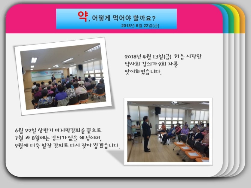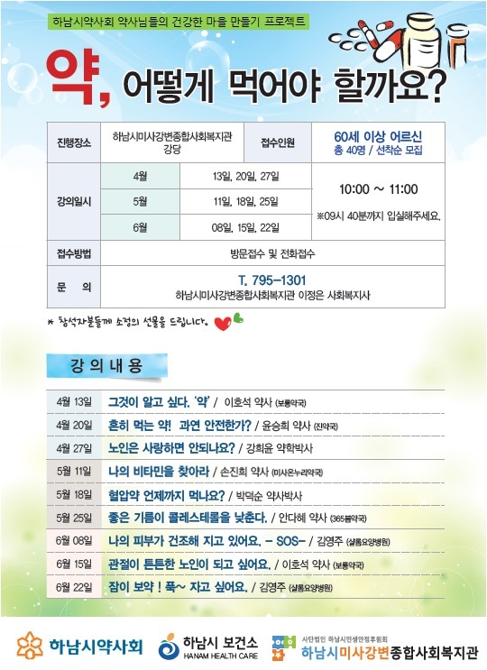 이 사업은 하남지역 65세 이상 어르신을 대상으로 하남시약사회 소속 약사님들의 재능기부로 각 주제(약복용법, 고혈압, 관절 등)에 따른 교육으로 2018년 6월 22일 상반기 교육을 마치고, 하반기 9월–11월 교육이 하남시미사강변종합사회복지관 강당에서 진행될 예정입니다.