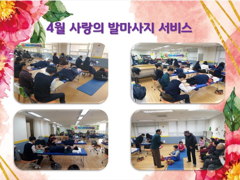 늘 지역사회 내 독거어르신들을 위해 사랑과 나눔을 전해주시는 봉사자 분들에게 진심으로 감사드리며 발마사지 서비스는 매주 목요일 17시에 아이사랑놀이터에서 진행 될 예정입니다.