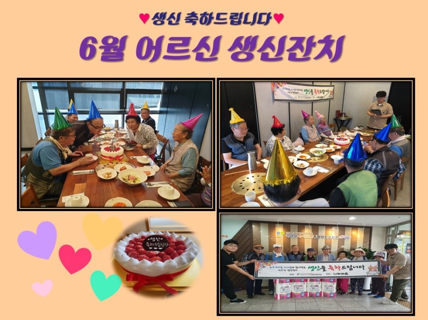 가치있는 나눔과 더불어 함께하는 마을을 만들기 위하여 우리 복지관에서 진행하는 어르신 생신잔치는 매월 1회(수요일) 지속적으로 진행 될 예정입니다.