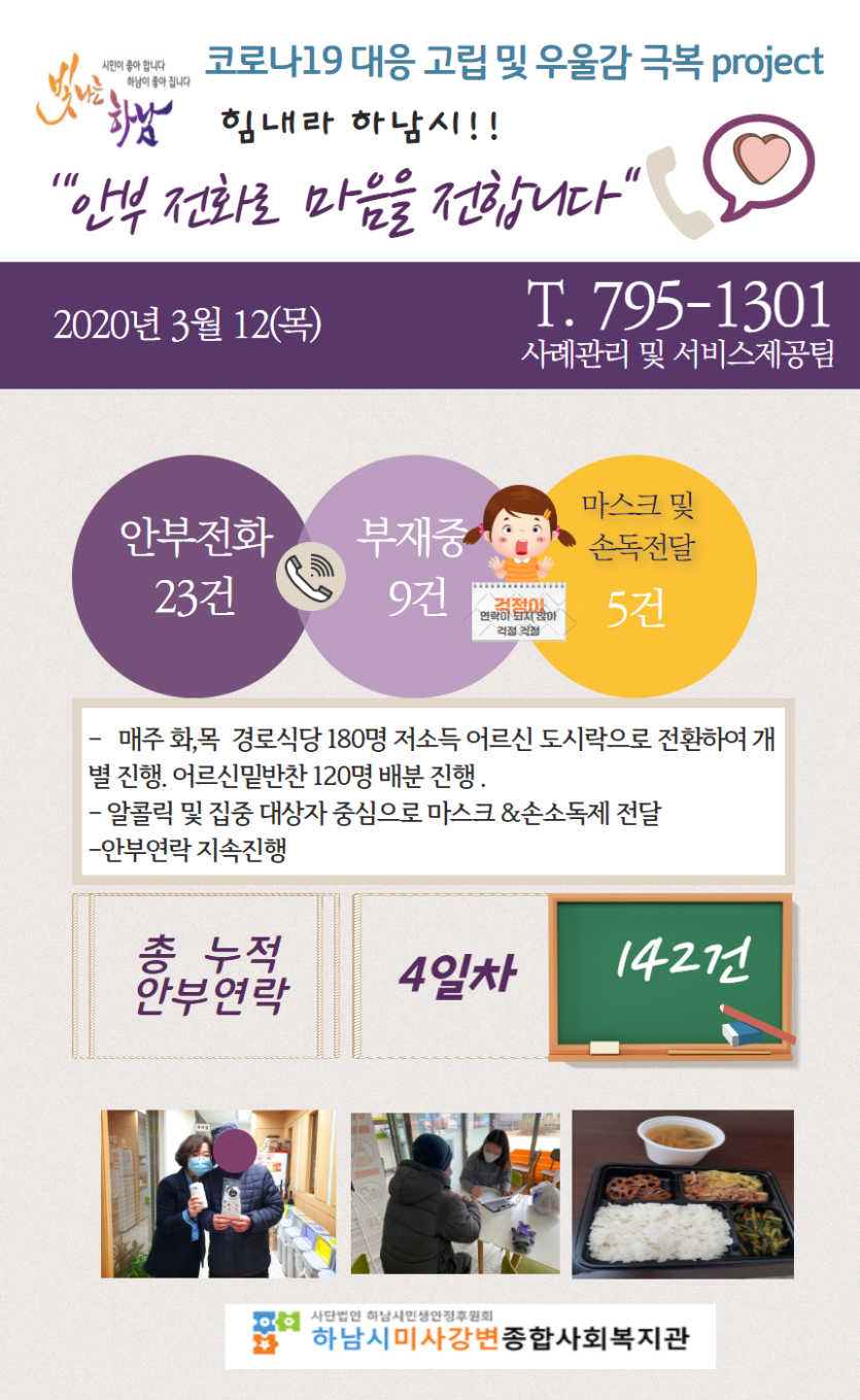 3월 12일 코로나19 극복! 안부전화로 마음을 전합니다. 게시글 작성정보 작성자 관리자 작성일 20-03-12 18:07 조회수 2,567 댓글수 0 목록 게시글 본문 - 첨부파일 1개 3월 12일.png (1.2M) 0회 다운로드 첨부일시 : 2020-03-12 18:07:00 이전글 (3/11) 18시 코로나19 유행 하.지.마! 캠페인 동참 감사드립니다. 20-03-12 다음글 안부전화로 마음을 전합니다 ! 20-03-12 댓글 0 등록된 댓글이 없습니다. 목록