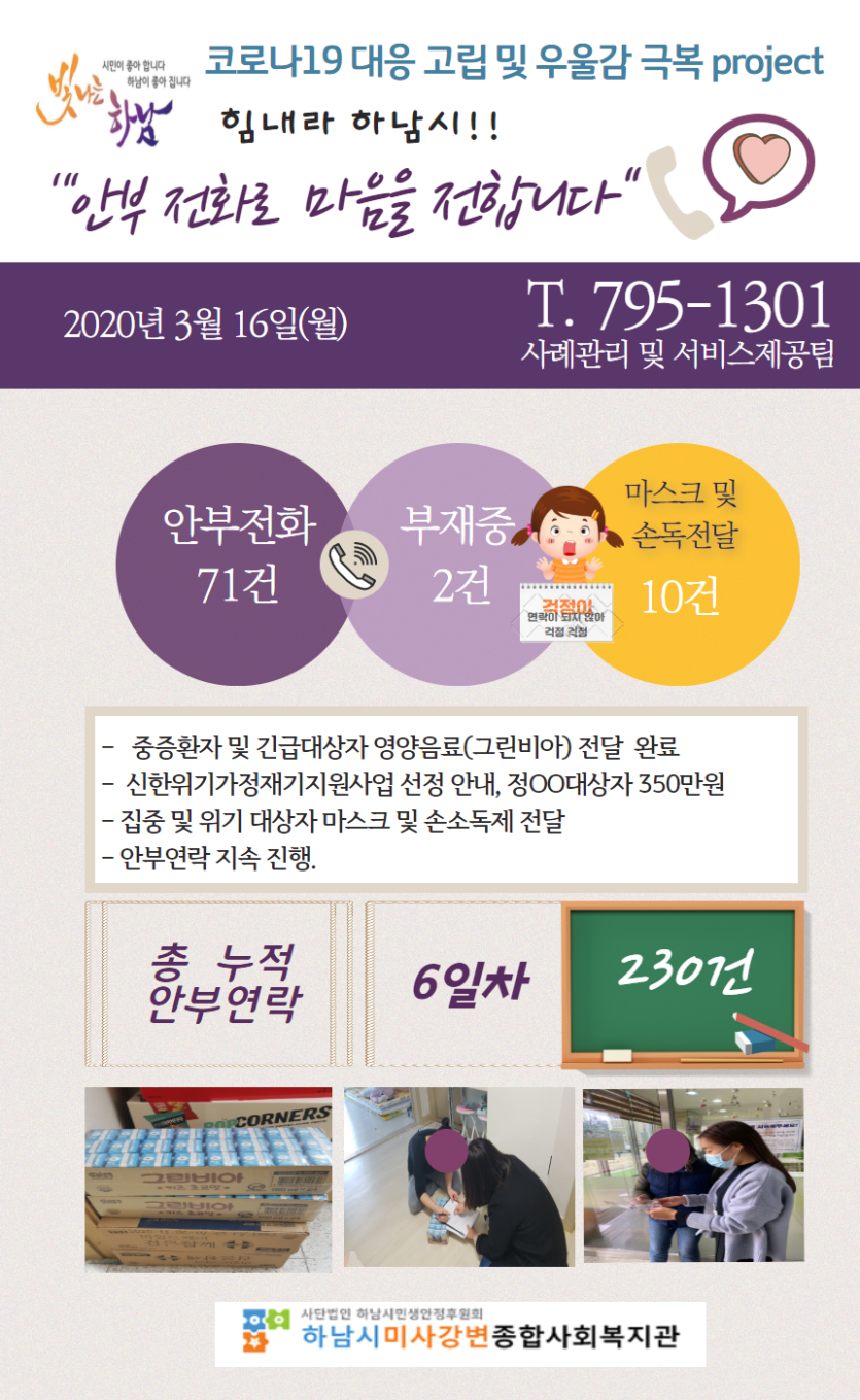 3월 16일 코로나19 극복! 안부전화로 마음을 전합니다. 게시글 작성정보 작성자 관리자 작성일 20-03-16 18:07 조회수 2,648 댓글수 0 목록 게시글 본문 - 첨부파일 1개 3월 16일.png (1.2M) 0회 다운로드 첨부일시 : 2020-03-16 18:07:00 이전글 (3/17) 13시 코로나19 유행 하.지.마! 캠페인 동참 감사드립니다. 20-03-17 다음글 코로나19 유행 하.지.마 캠페인 2차 진행현황 20-03-16 댓글 0 등록된 댓글이 없습니다. 목록