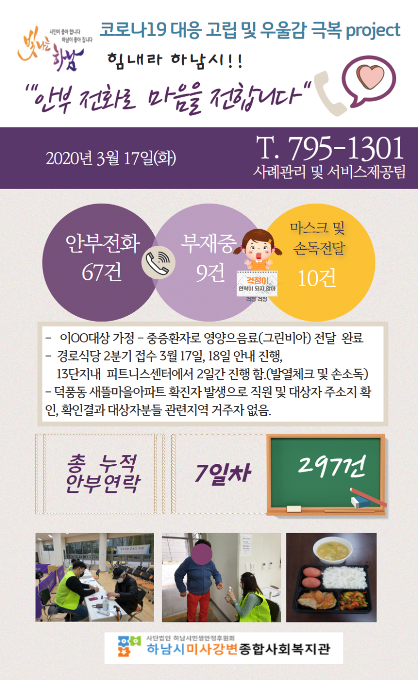 3월 17일 코로나19 극복! 안부전화로 마음을 전합니다. 게시글 작성정보 작성자 관리자 작성일 20-03-17 18:12 조회수 3,263 댓글수 0 목록 게시글 본문 - 첨부파일 1개 3월 17일.png (1.2M) 0회 다운로드 첨부일시 : 2020-03-17 18:12:00 이전글 코라나19 극복 프로젝트 20-03-18 다음글 (3/17) 13시 코로나19 유행 하.지.마! 캠페인 동참 감사드립니다. 20-03-17 댓글 0 등록된 댓글이 없습니다. 목록