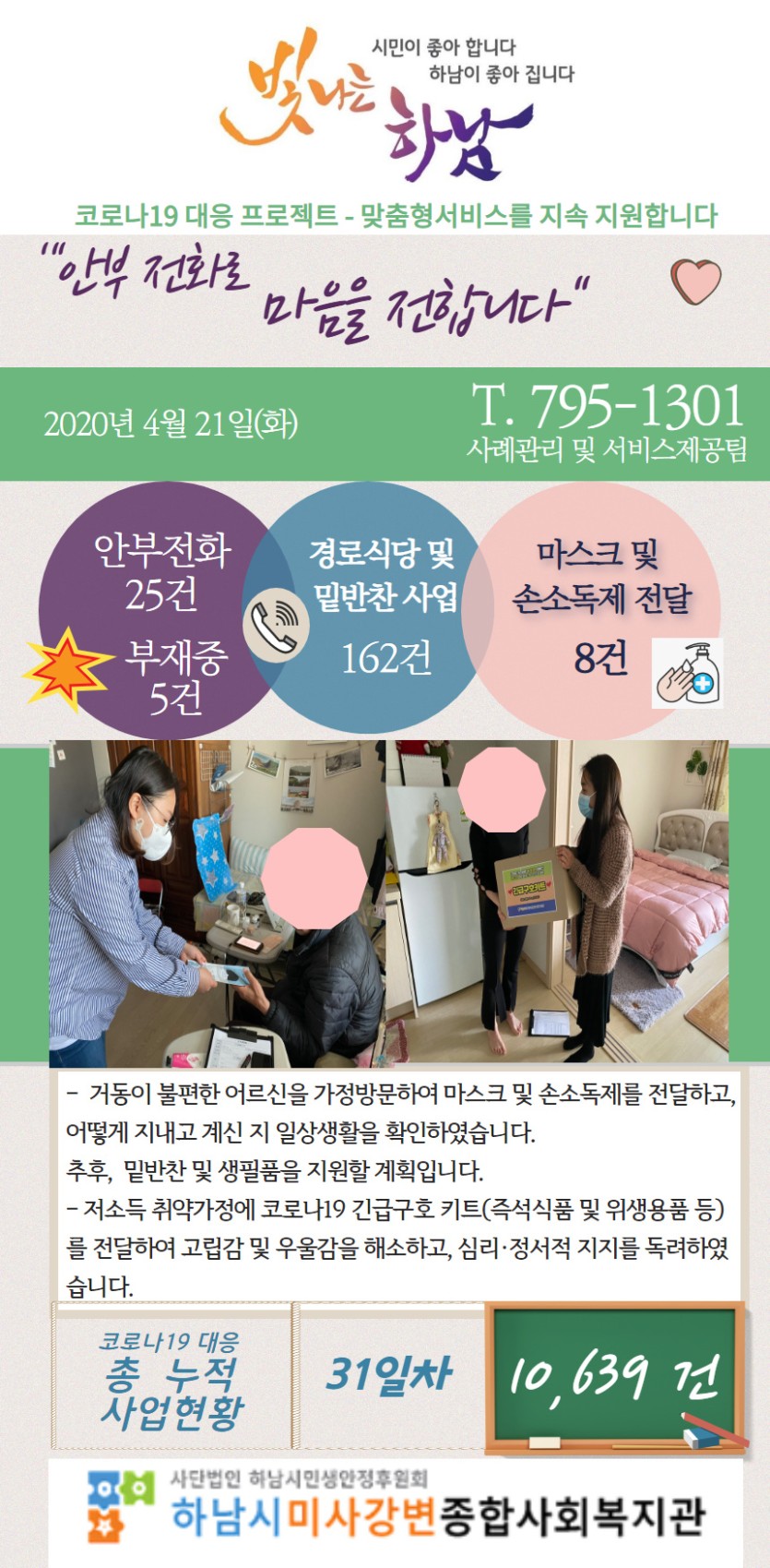 4월 21일 코로나19 극복! 안부전화로 마음을 전합니다. 게시글 작성정보 작성자 관리자 작성일 20-04-21 17:30 조회수 2,733 댓글수 0 목록 게시글 본문 - 첨부파일 1개 4.21.jpg (733.5K) 0회 다운로드 첨부일시 : 2020-04-21 17:30:00 이전글 4월 22일 코로나19 극복! 안부전화로 마음을 전합니다. 20-04-22 다음글 4월 20일 코로나19 극복! 안부전화로 마음을 전합니다. 20-04-20 댓글 0 등록된 댓글이 없습니다. 목록