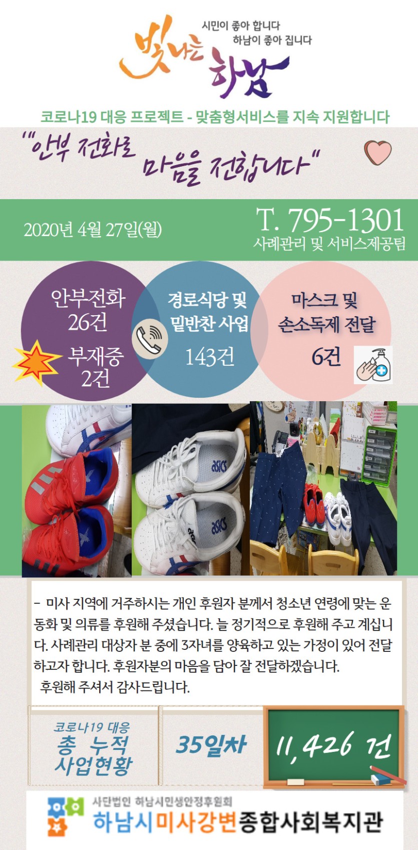 4월 27일 코로나19 극복! 안부전화로 마음을 전합니다. 게시글 작성정보 작성자 관리자 작성일 20-04-27 17:32 조회수 2,800 댓글수 0 목록 게시글 본문 - 첨부파일 1개 4.27.jpg (749.3K) 0회 다운로드 첨부일시 : 2020-04-27 17:32:30 이전글 5월 12일 코로나19 극복! 안부전화로 마음을 전합니다. 20-05-12 다음글 4월 24일 코로나19 극복! 안부전화로 마음을 전합니다. 20-04-24 댓글 0 등록된 댓글이 없습니다. 목록