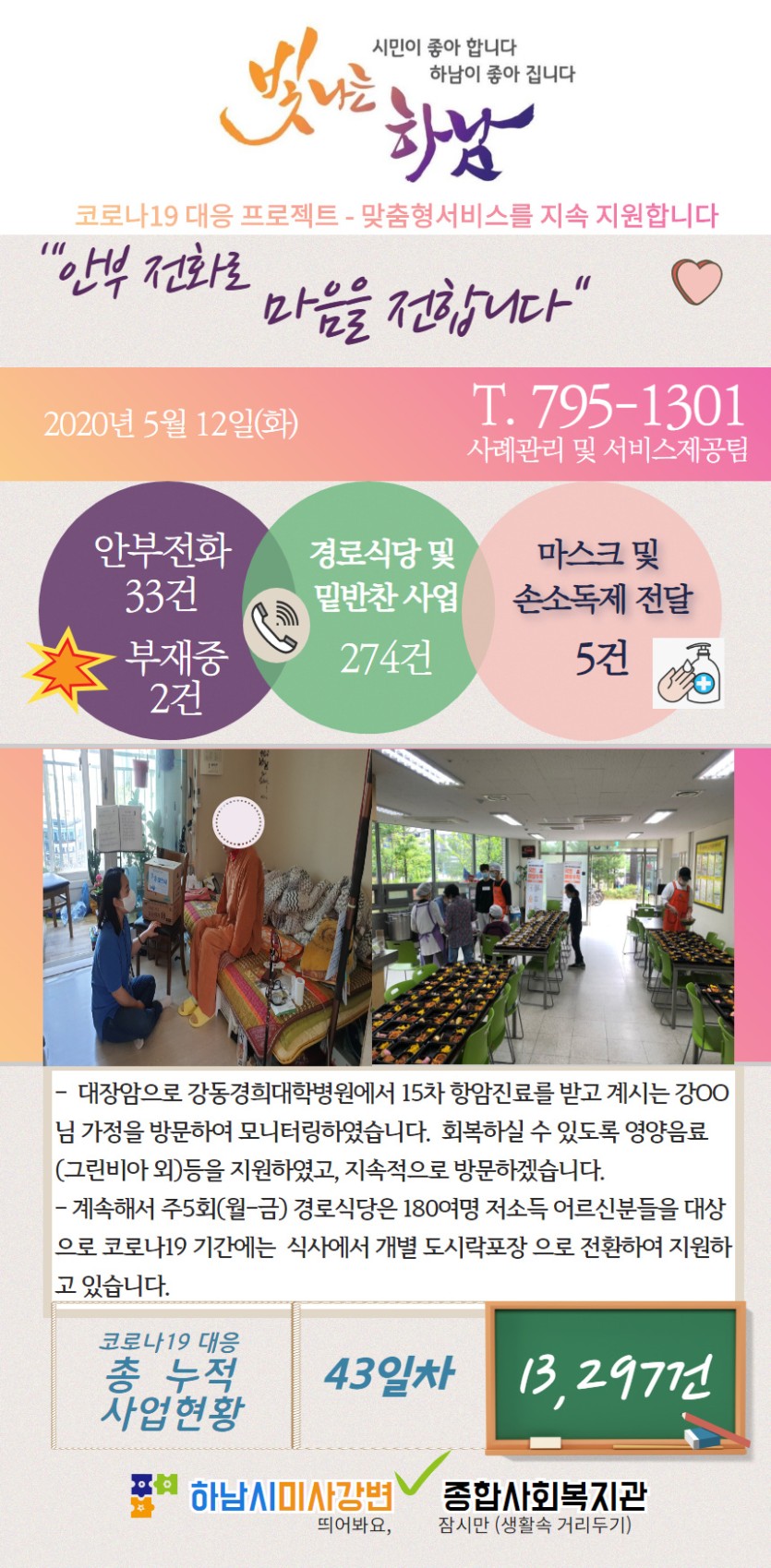 5월 12일 코로나19 극복! 안부전화로 마음을 전합니다. 게시글 작성정보 작성자 관리자 작성일 20-05-12 17:59 조회수 3,017 댓글수 0 목록 게시글 본문 - 첨부파일 1개 5.12화.jpg (819.9K) 0회 다운로드 첨부일시 : 2020-05-12 17:59:00 이전글 5월 13일 코로나19 극복! 안부전화로 마음을 전합니다. 20-05-13 다음글 4월 27일 코로나19 극복! 안부전화로 마음을 전합니다. 20-04-27 댓글 0 등록된 댓글이 없습니다. 목록