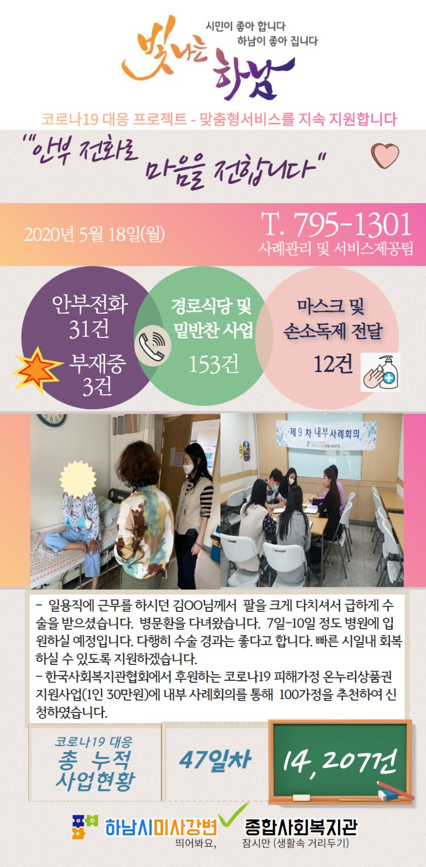 5월 18일 코로나19 극복! 안부전화로 마음을 전합니다. 게시글 작성정보 작성자 관리자 작성일 20-05-18 18:00 조회수 2,630 댓글수 0 목록 게시글 본문 - 첨부파일 1개 5.18월.jpg (809.8K) 0회 다운로드 첨부일시 : 2020-05-18 18:00:00 이전글 5월 19일 코로나19 극복! 안부전화로 마음을 전합니다. 20-05-19 다음글 5월 15일 코로나19 극복! 안부전화로 마음을 전합니다. 20-05-15 댓글 0 등록된 댓글이 없습니다. 목록