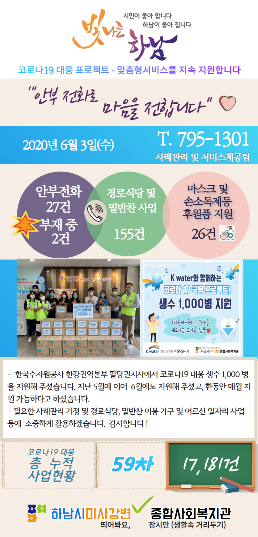 6월 3일 코로나19 극복! 안부전화로 마음을 전합니다. 게시글 작성정보 작성자 관리자 작성일 20-06-03 17:18 조회수 3,087 댓글수 0 목록 게시글 본문 - 첨부파일 1개 6.3.png (794.8K) 0회 다운로드 첨부일시 : 2020-06-03 17:18:00 이전글 6월 4일 코로나19 극복! 안부전화로 마음을 전합니다. 20-06-04 다음글 복지관의 따끈한 소식을 듣고 싶다면? 20-06-03 댓글 0 등록된 댓글이 없습니다. 목록