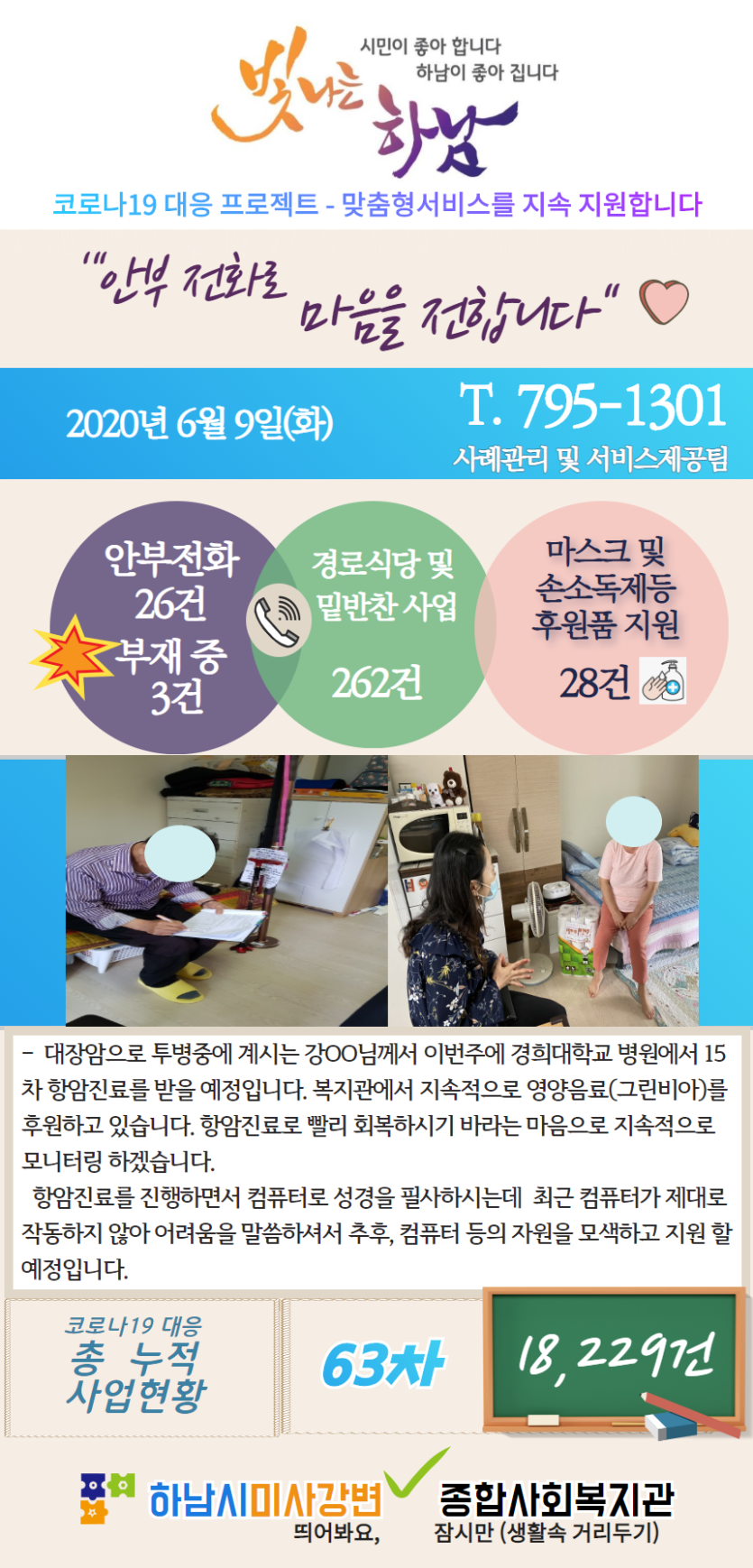 6월 9일 코로나19 극복! 안부전화로 마음을 전합니다. 게시글 작성정보 작성자 관리자 작성일 20-06-09 17:20 조회수 3,295 댓글수 0 목록 게시글 본문 - 첨부파일 1개 6.9.png (853.8K) 0회 다운로드 첨부일시 : 2020-06-09 17:20:00 이전글 6월 10일 코로나19 극복! 안부전화로 마음을 전합니다. 20-06-10 다음글 6월 8일 코로나19 극복! 안부전화로 마음을 전합니다. 20-06-08 댓글 0 등록된 댓글이 없습니다. 목록