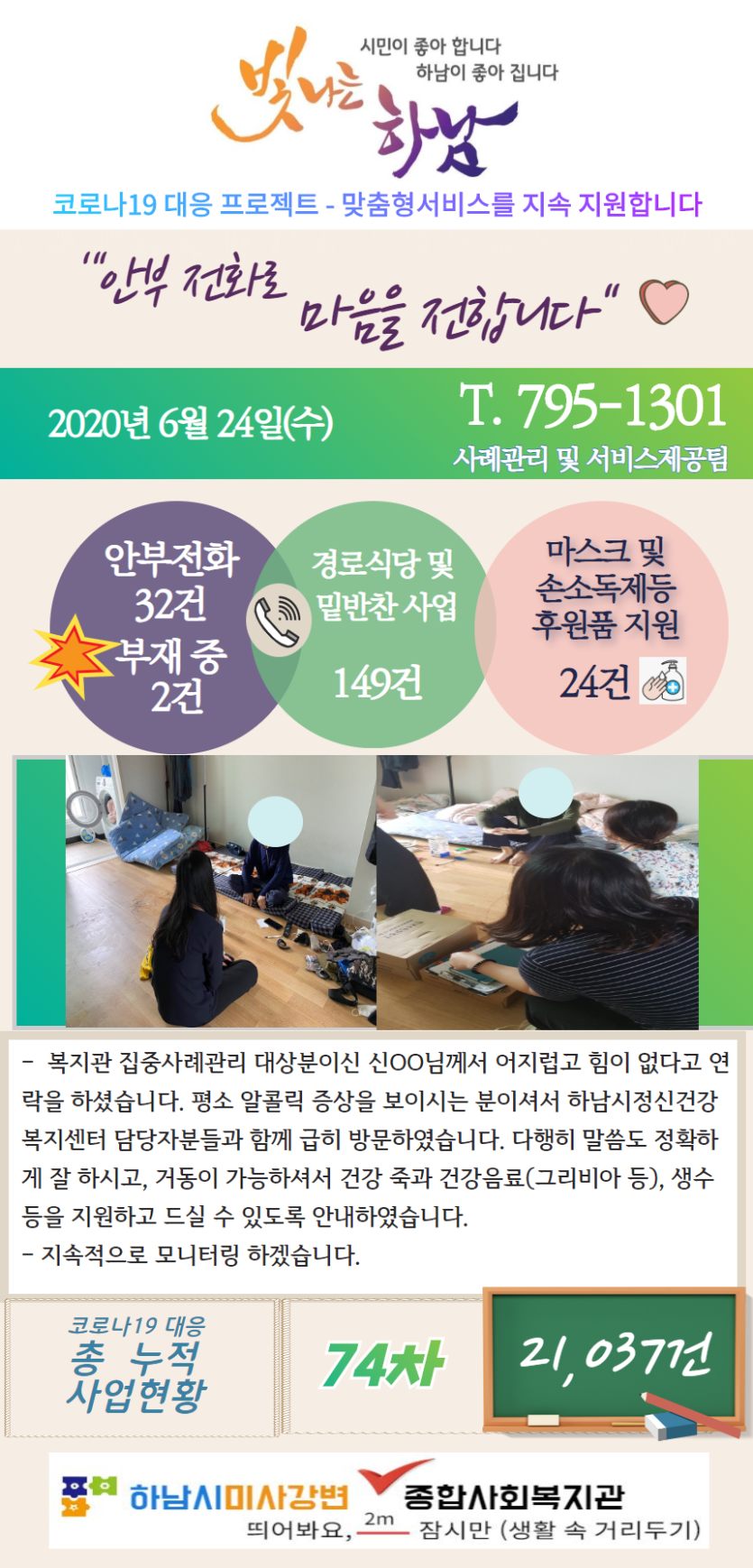 6월 24일 코로나19 극복! 안부전화로 마음을 전합니다. 게시글 작성정보 작성자 관리자 작성일 20-06-24 12:06 조회수 2,819 댓글수 0 목록 게시글 본문 - 첨부파일 1개 6.24.png (920.1K) 0회 다운로드 첨부일시 : 2020-06-24 12:06:00 이전글 6월 25일 코로나19 극복! 안부전화로 마음을 전합니다. 20-06-25 다음글 6월 23일 코로나19 극복! 안부전화로 마음을 전합니다. 20-06-23 댓글 0 등록된 댓글이 없습니다. 목록