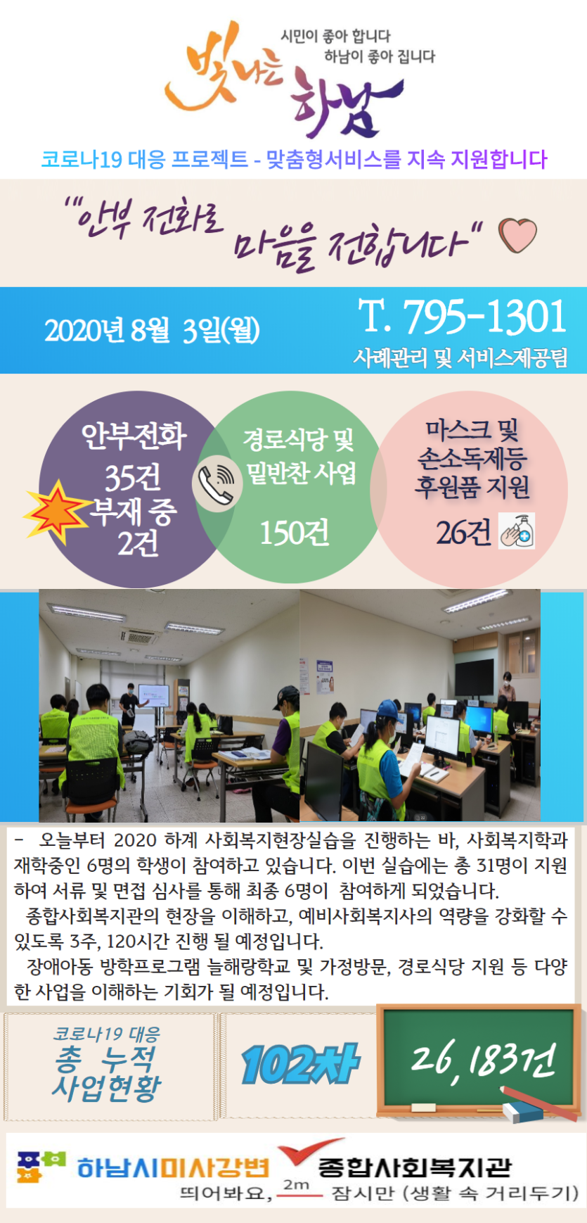 8월 3일 코로나19 극복! 안부전화로 마음을 전합니다. 게시글 작성정보 작성자 관리자 작성일 20-08-03 09:20 조회수 3,375 댓글수 0 목록 게시글 본문 - 첨부파일 1개 8.3.png (924.5K) 0회 다운로드 첨부일시 : 2020-08-03 09:20:00 이전글 8월 4일 코로나19 극복! 안부전화로 마음을 전합니다. 20-08-04 다음글 단계적 운영 재개 Coming Soon~~!! 20-07-31 댓글 0 등록된 댓글이 없습니다. 목록