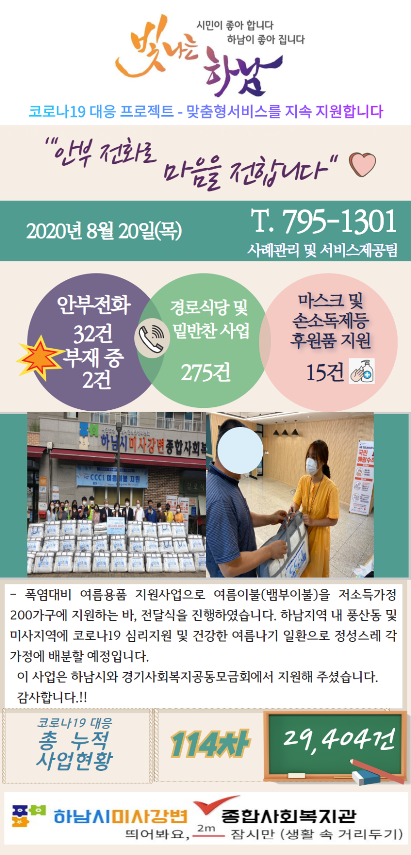 8월 20일 코로나19 극복! 안부전화로 마음을 전합니다. 게시글 작성정보 작성자 관리자 작성일 20-08-20 09:28 조회수 3,238 댓글수 0 목록 게시글 본문 - 첨부파일 1개 8.20.png (1.0M) 0회 다운로드 첨부일시 : 2020-08-20 09:28:00 이전글 하남시와 하남시미사강변종합사회복지관이 함께하는 ‘폭염대비 취약계층 여름용품(이불) 지원 사업 20-08-20 다음글 8월19일 코로나19 극복! 안부전화로 마음을 전합니다. 20-08-19 댓글 0 등록된 댓글이 없습니다. 목록