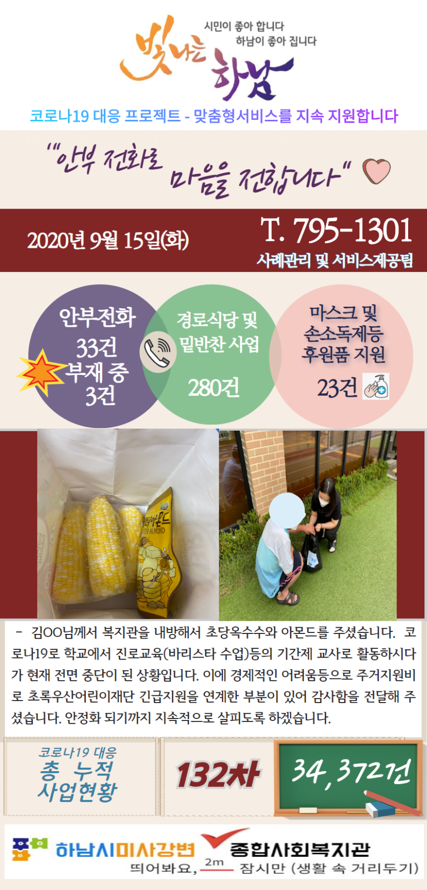 9월 15일 코로나19 극복! 안부전화로 마음을 전합니다. 게시글 작성정보 작성자 관리자 작성일 20-09-15 13:49 조회수 3,018 댓글수 0 목록 게시글 본문 - 첨부파일 1개 9.15.png (1.1M) 0회 다운로드 첨부일시 : 2020-09-15 13:49:00 이전글 9월 16일 코로나19 극복! 안부전화로 마음을 전합니다. 20-09-16 다음글 9월 14일 코로나19 극복! 안부전화로 마음을 전합니다. 20-09-14 댓글 0 등록된 댓글이 없습니다. 목록
