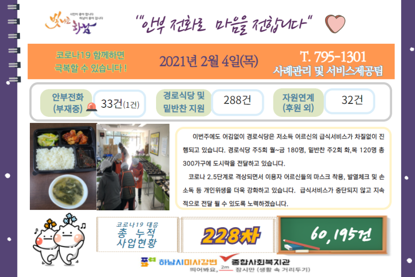 2월 4일 코로나19 극복! 안부전화로 마음을 전합니다. 게시글 작성정보 작성자 관리자 작성일 21-02-04 17:46 조회수 2,528 댓글수 0 목록 게시글 본문 - 첨부파일 1개 2.4.png (351.6K) 0회 다운로드 첨부일시 : 2021-02-04 17:46:00 이전글 2월 5일 코로나19 극복! 안부전화로 마음을 전합니다. 21-02-05 다음글 2월 3일 코로나19 극복! 안부전화로 마음을 전합니다. 21-02-03 댓글 0 등록된 댓글이 없습니다. 목록