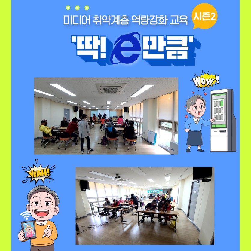 미디어 취약계층인 만 50세 이상 중장년 및 노인을 대상으로 미디어 활용능력 강화 및 고립감 완화를 위한 스마트폰, 키오스크(무인결제기), 비대면 화상 교육인 만큼 올 4월부터 7월까지는 기본 반, 7월부터 9월까지는 심화 반으로 진행하고 있습니다.