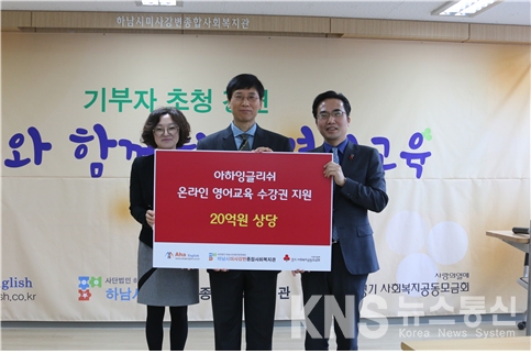 [KNS뉴스통신=서혜정 기자] 저소득층 학생들의 사교육 부담을 덜어주기 위해 영어 컨텐츠 개발 업체인 ㈜아하잉글리쉬(대표 임상철)가 20일 하남시미사강변종합사회복지관에서 20억원 상당의 영어교육 온라인 수강권을 경기사회복지공동모금회(회장 최신원)에 기부했다. 이날 전달식에는 임상철 ㈜아하잉글리쉬 대표와 김효진 경기사회복지공동모금회 사무처장, 조혜연 하남시미사강변종합사회복지관 관장 및 영어 수강권 지원 대상자와 지역 주민들이 참석했다. 특히 이번 전달식에서는 임상철 ㈜아하잉글리쉬 대표가 수강권 지원 대상자 및 하남시 지역 주민을 대상으로 ‘부모와 함께하는 영어교육’ 강의를 진행했다. 경기공동모금회는 교육 대상자를 선정해 각 가정에서 아하잉글리쉬 홈페이지 접속해 영어 공부를 할 수 있도록 지원한다. 아하잉글리쉬는 2014년에 성남시 내 저소득가정에게 영어 교육 온라인 수강권을 기부했으며, 작년에는 경기공동모금회와의 ‘교육나눔 사회공헌 업무협약’을 체결해 경기도 내 저소득가정에게 1년치 영어교육 수강권을 기부했다. 아하잉글리쉬는 이번 수강권 기부를 포함해 약 58억 상당의 온라인 영어교육 수강권을 저소득가정에게 전달했다. 임상철 아하잉글리쉬 대표는 “교육의 기회가 없어서 배우지 못하는 것은 정말 안타까운 일이다”라며 “온라인 수강권을 통해 교육 소외계층의 이웃들이 자신의 꿈을 키워나갔으면 좋겠다”고 말했다. 서혜정 기자 alfime@kns.tv <저작권자 © KNS뉴스통신, 무단 전재 및 재배포 금지> |