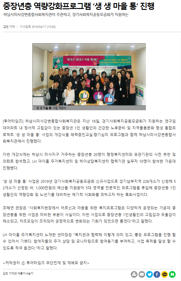 2019 특화사업 '생생마을통' 게시글 작성정보 작성자 관리자 작성일 19-04-19 18:06 조회수 3,577 댓글수 0 목록 게시글 본문 첨부파일 1개 2019 특화사업 생생마을통 보도자료.png (248.8K) 0회 다운로드 첨부일시 : 2019-04-19 18:06:13 관련링크 1개 http://www.tourtimes.net/sub_read.html?uid=85864 0회 연결 이전글 2019 복지관-한화건설 꿈에그린 도서관 제82호점 개관 19-04-30 다음글 2019 LH마이홈센터와 함께하는 '다함께가요 동네한바퀴' 마을돌봄프로젝트 19-04-15 댓글 0 등록된 댓글이 없습니다. 목록