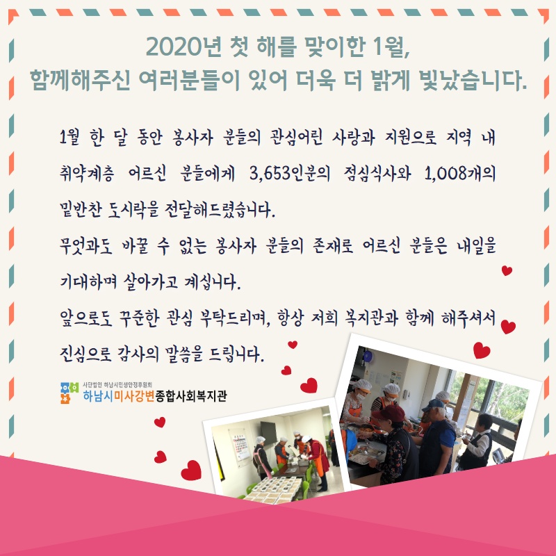 자원봉사자 1월 감사편지 게시글 작성정보 작성자 관리자 작성일 20-01-31 14:00 조회수 2,460 댓글수 0 목록 게시글 본문 하남시미사강변종합사회복지관 올림 첨부파일 1개 1월 감사문자.jpg (188.3K) 0회 다운로드 첨부일시 : 2020-01-31 14:00:00 이전글 후원자 1월 감사편지 20-01-31 댓글 0 등록된 댓글이 없습니다. 목록