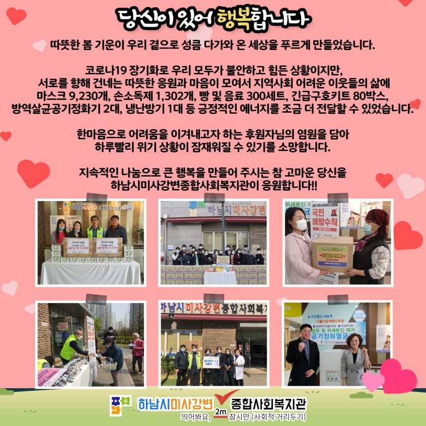 후원자 4월 감사편지 게시글 작성정보 작성자 관리자 작성일 20-04-30 14:00 조회수 3,112 댓글수 0 목록 게시글 본문 하남시미사강변종합사회복지관 올림 첨부파일 1개 후원자 4월 감사편지.jpg (1.1M) 0회 다운로드 첨부일시 : 2020-04-30 14:00:00 이전글 자원봉사자 5월 감사편지 20-05-29 다음글 자원봉사자 4월 감사편지 20-04-30 댓글 0 등록된 댓글이 없습니다. 목록