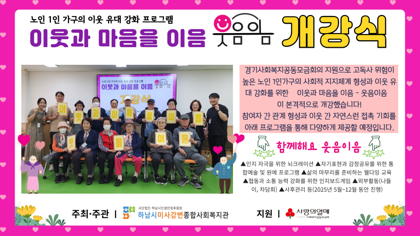 고독사 위험이 높은 노인 1인가구의 사회적 지지체계 형성과 이웃 유대 강화를 위한 『이웃과 마음을 이음 - 웃음이음』 프로그램은 복지관이 2024년 시범사업으로 시작한 고독사 예방사업의 일환으로, 올해 2차년도 사업으로 확대·운영되며, 5월 29일(목) 개강식을 시작으로 본격적인 활동이 진행됩니다~!