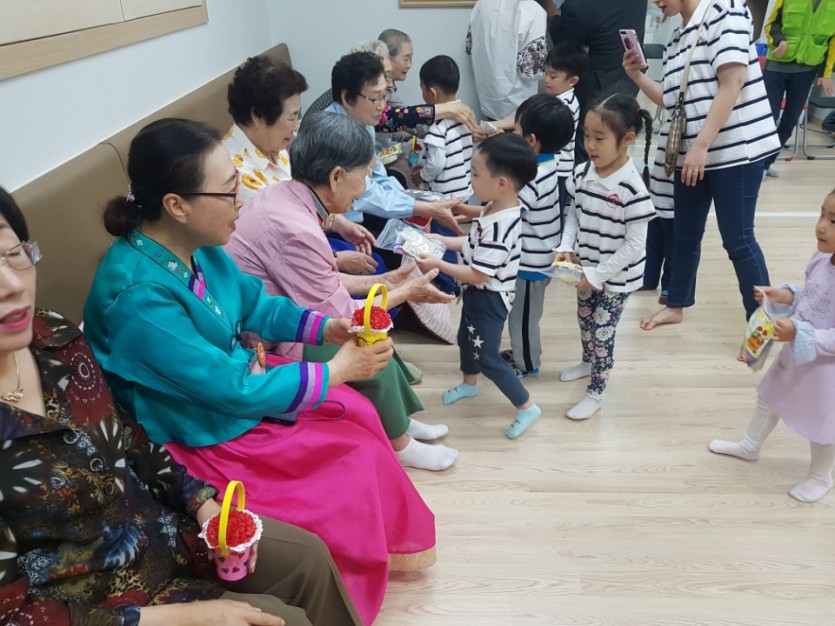 카네이션하우스 어르신들께 어린이들처럼 예쁜 카네이션화분을 간식거리와 함께 어르신들 일일이 드리고, 멋진 율동과 함께 동요를 열심히 불러 드렸습니다.