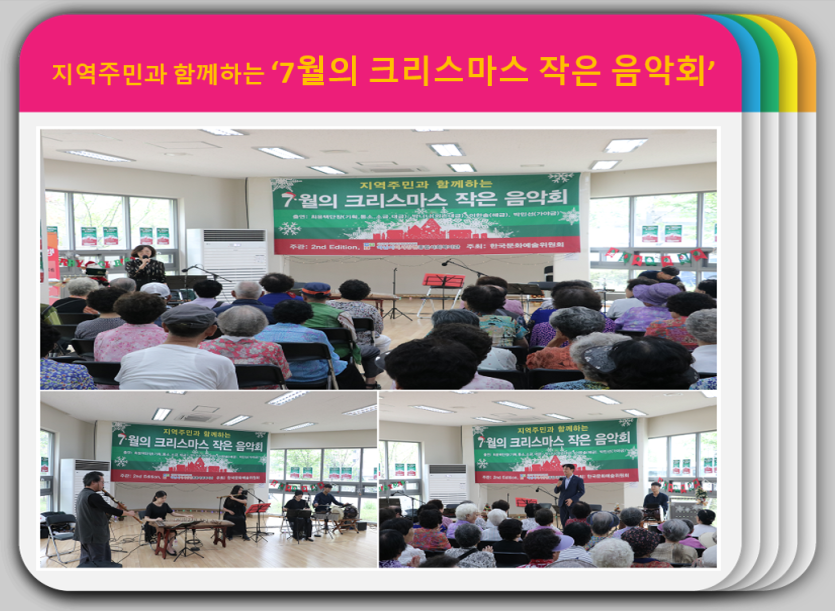 행사내용으로는 소리마당 최윤택 단장을 중심으로 대금(박니나, 2018 평창패럴림픽 폐막식 공연)·해금(이한솔)·가야금(박민선)·장구(김성회) 공연을 진행하여 무더운 여름날 미리 맞이하는 크리스마스 음악회로 시원함을 느끼고, 지역주민의 사랑을 나누는 뜻깊은 시간을 보냈습니다.