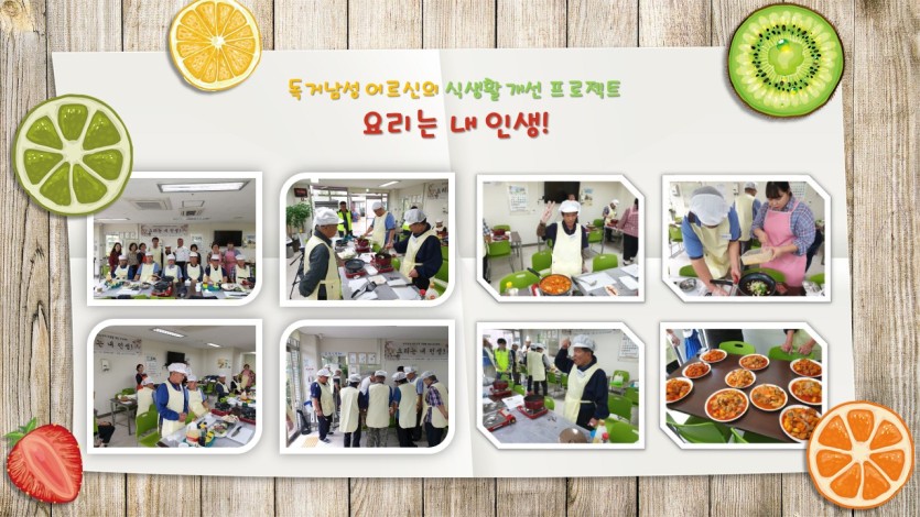 우리복지관에서는 삼성카드 열린나눔, 아이들과 미래재단의 지원으로 2018년 독거남성 어르신의 식생활 개선 프로젝트 ‘요리는 내 인생!’ 프로그램을 계획하여 진행하고 있습니다. ‘요리는 내 인생!’ 사업은 2018년 1월에 삼성카드 열린나눔이 주관한 온라인 투표에서 지역주민 분들이 함께하여 최종 2위(1,259표)를 통해 사업이 확정된 바 있습니다.