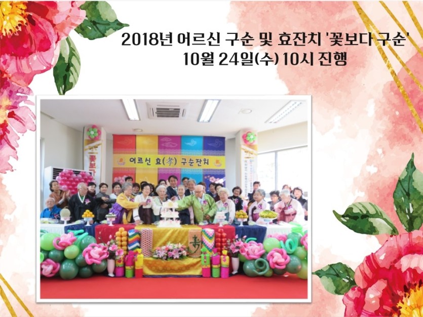 2018년 10월 24일 하남시미사강변종합사회복지관(관장 조혜연)과 하남시자원봉사단체협의회(회장강성례)가 공동주관하는 ‘어르신 효(孝) 구순잔치 : 꽃보다 구순’사업이 하남시미사강변종합사회복지관 피트니스센터에서 진행되었습니다.