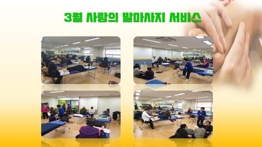 우리 복지관에서는 발사랑봉사단에서 매주 목요일에 지역사회 내 독거어르신들에게 발마사지 서비스를 제공하고 있습니다.
