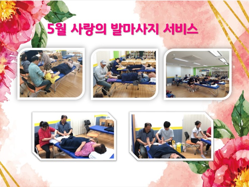 늘 지역사회 내 독거어르신들을 위해 사랑과 나눔을 전해주시는 봉사자 분들에게 진심으로 감사드리며 발마사지 서비스는 매주 목요일 17시에 아이사랑놀이터에서 진행 될 예정입니다.