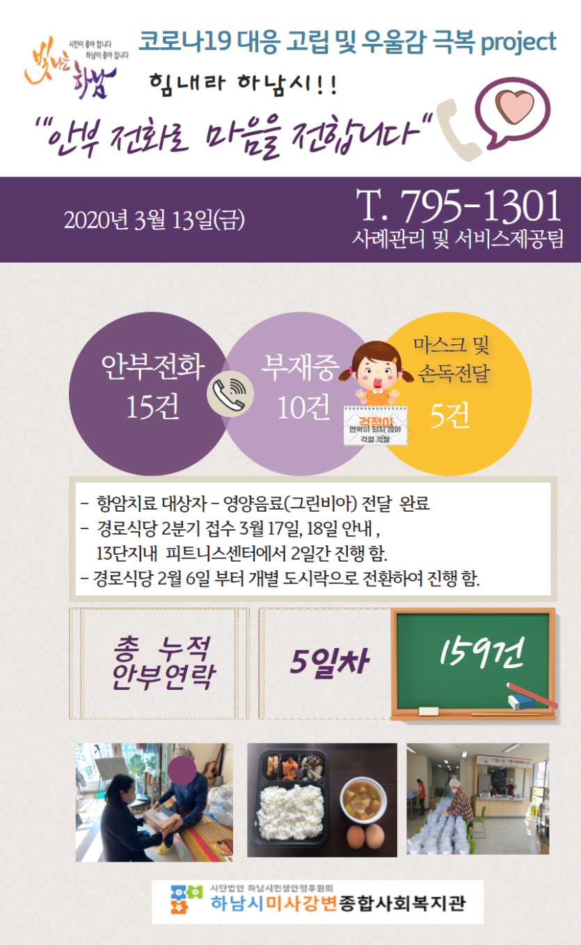 3월 13일 코로나19 극복! 안부전화로 마음을 전합니다. 게시글 작성정보 작성자 관리자 작성일 20-03-13 18:07 조회수 2,880 댓글수 0 목록 게시글 본문 - 첨부파일 1개 3월 13일.png (1.2M) 2회 다운로드 첨부일시 : 2020-03-13 18:07:00 이전글 (3/13) 18시 코로나19 유행 하.지.마! 캠페인 동참 감사드립니다. 20-03-13 다음글 경로식당 코로나19 극복 프로젝트 20-03-13 댓글 0 등록된 댓글이 없습니다. 목록