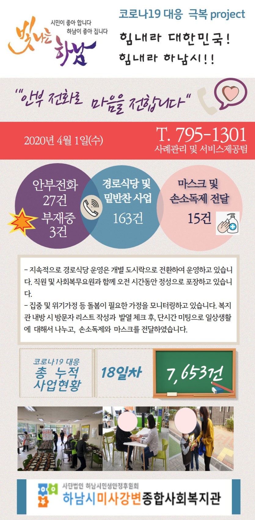 4월 1일 코로나19 극복! 안부전화로 마음을 전합니다. 게시글 작성정보 작성자 관리자 작성일 20-04-01 18:00 조회수 2,978 댓글수 0 목록 게시글 본문 - 첨부파일 1개 4월1일.jpg (546.8K) 0회 다운로드 첨부일시 : 2020-04-01 18:00:00 이전글 4월 2일 코로나19 극복! 안부전화로 마음을 전합니다. 20-04-02 다음글 (4/1) 17시 코로나19 유행 하.지.마! 캠페인 동참 감사드립니다. 20-04-01 댓글 0 등록된 댓글이 없습니다. 목록