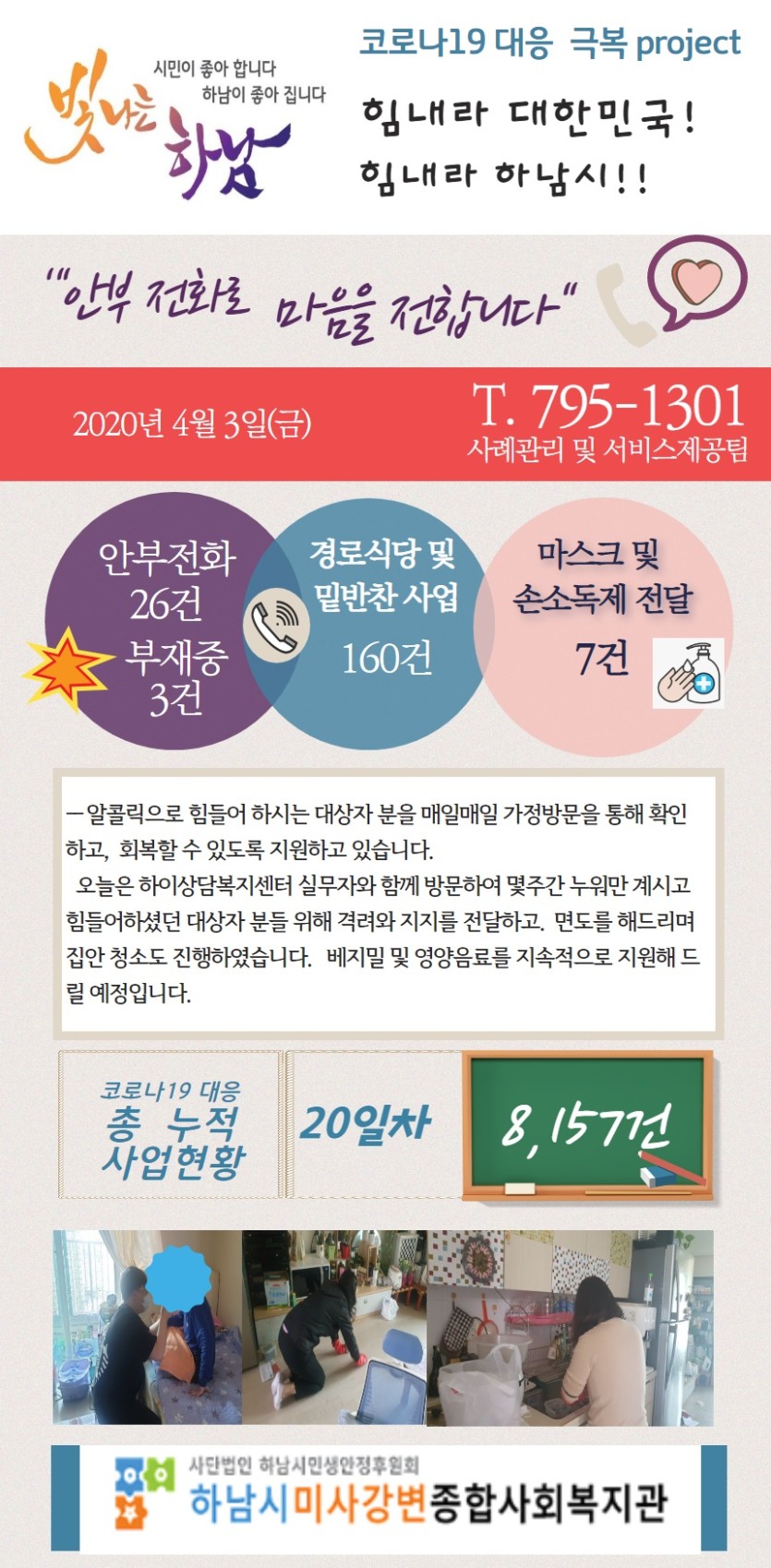 4월 3일 코로나19 극복! 안부전화로 마음을 전합니다. 게시글 작성정보 작성자 관리자 작성일 20-04-03 18:00 조회수 3,052 댓글수 0 목록 게시글 본문 - 첨부파일 1개 4월3일.jpg (527.3K) 1회 다운로드 첨부일시 : 2020-04-03 18:00:00 이전글 4월 6일 코로나19 극복! 안부전화로 마음을 전합니다. 20-04-06 다음글 4월 2일 코로나19 극복! 안부전화로 마음을 전합니다. 20-04-02 댓글 0 등록된 댓글이 없습니다. 목록
