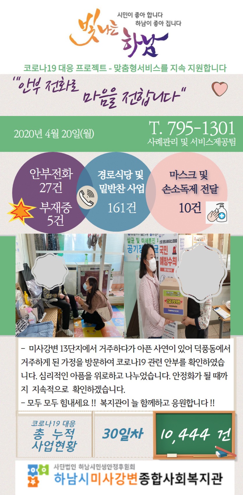 4월 20일 코로나19 극복! 안부전화로 마음을 전합니다. 게시글 작성정보 작성자 관리자 작성일 20-04-20 17:30 조회수 3,311 댓글수 0 목록 게시글 본문 - 첨부파일 1개 4.20.jpg (751.2K) 0회 다운로드 첨부일시 : 2020-04-20 17:30:00 이전글 4월 21일 코로나19 극복! 안부전화로 마음을 전합니다. 20-04-21 다음글 (3/18) 18시 코로나19 유행 하.지.마! 캠페인 동참 감사드립니다. 20-04-18 댓글 0 등록된 댓글이 없습니다. 목록
