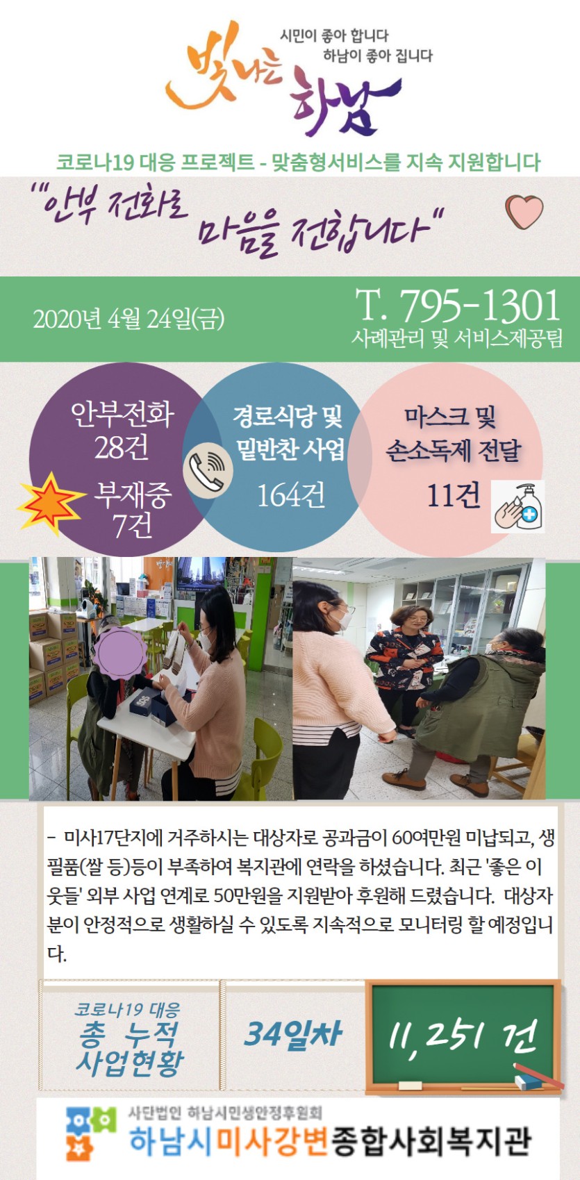 4월 24일 코로나19 극복! 안부전화로 마음을 전합니다. 게시글 작성정보 작성자 관리자 작성일 20-04-24 17:31 조회수 3,485 댓글수 0 목록 게시글 본문 - 첨부파일 1개 4.24.jpg (741.3K) 0회 다운로드 첨부일시 : 2020-04-24 17:31:00 이전글 4월 27일 코로나19 극복! 안부전화로 마음을 전합니다. 20-04-27 다음글 4월 23일 코로나19 극복! 안부전화로 마음을 전합니다. 20-04-23 댓글 0 등록된 댓글이 없습니다. 목록