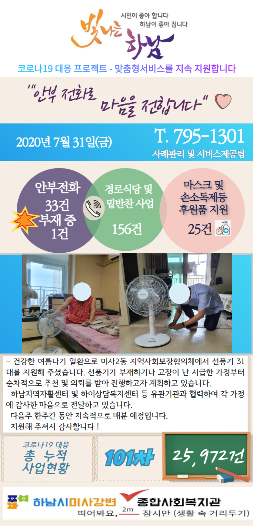 7월 31일 코로나19 극복! 안부전화로 마음을 전합니다. 게시글 작성정보 작성자 관리자 작성일 20-07-31 09:19 조회수 3,272 댓글수 0 목록 게시글 본문 - 첨부파일 1개 7.31.png (1,000.6K) 3회 다운로드 첨부일시 : 2020-07-31 09:19:00 이전글 단계적 운영 재개 Coming Soon~~!! 20-07-31 다음글 7월 30일 코로나19 극복! 안부전화로 마음을 전합니다. 20-07-30 댓글 0 등록된 댓글이 없습니다. 목록