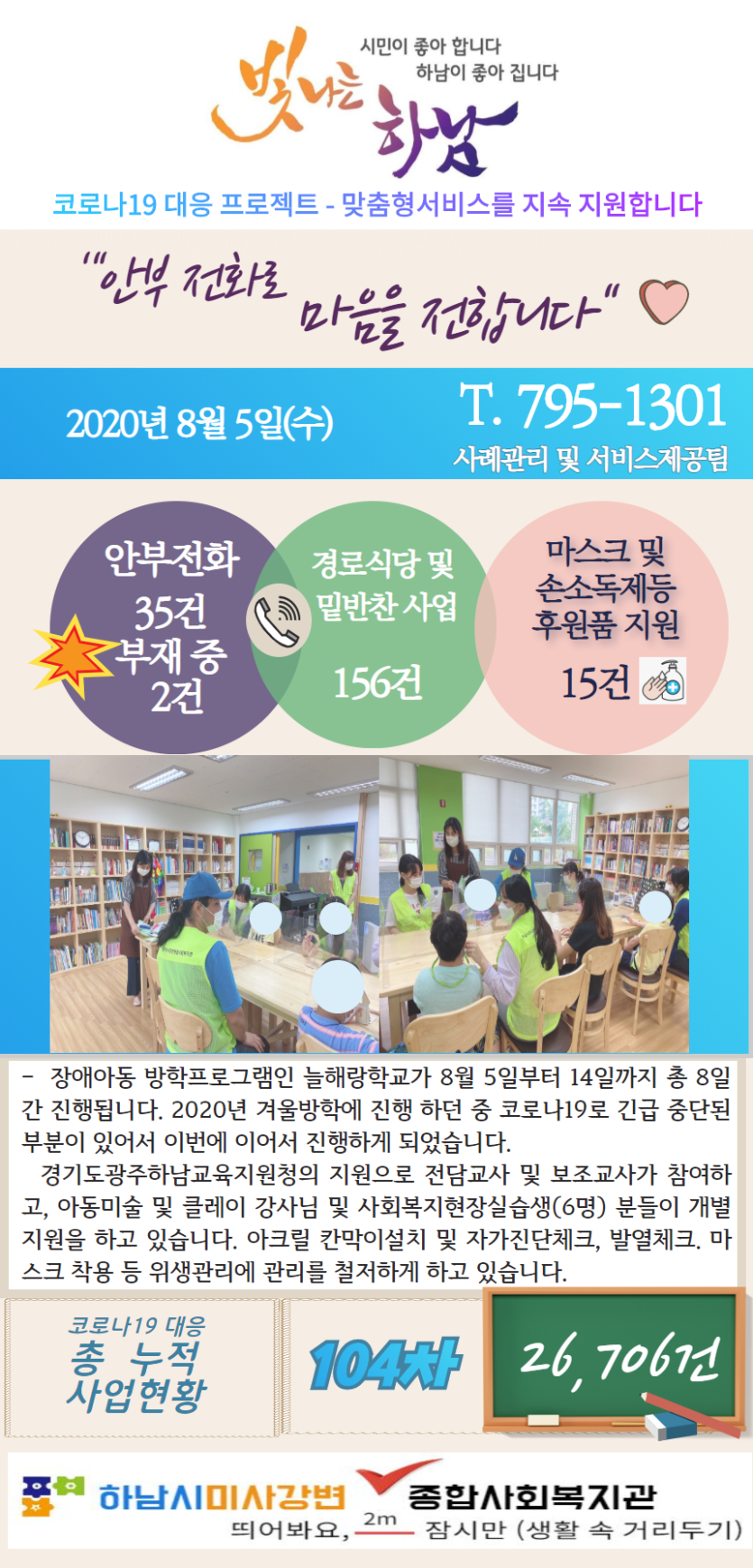 8월 5일 코로나19 극복! 안부전화로 마음을 전합니다. 게시글 작성정보 작성자 관리자 작성일 20-08-05 09:20 조회수 3,525 댓글수 0 목록 게시글 본문 - 첨부파일 1개 8.5.png (1.0M) 2회 다운로드 첨부일시 : 2020-08-05 09:20:00 이전글 8월 6일 코로나19 극복! 안부전화로 마음을 전합니다. 20-08-06 다음글 8월 4일 코로나19 극복! 안부전화로 마음을 전합니다. 20-08-04 댓글 0 등록된 댓글이 없습니다. 목록