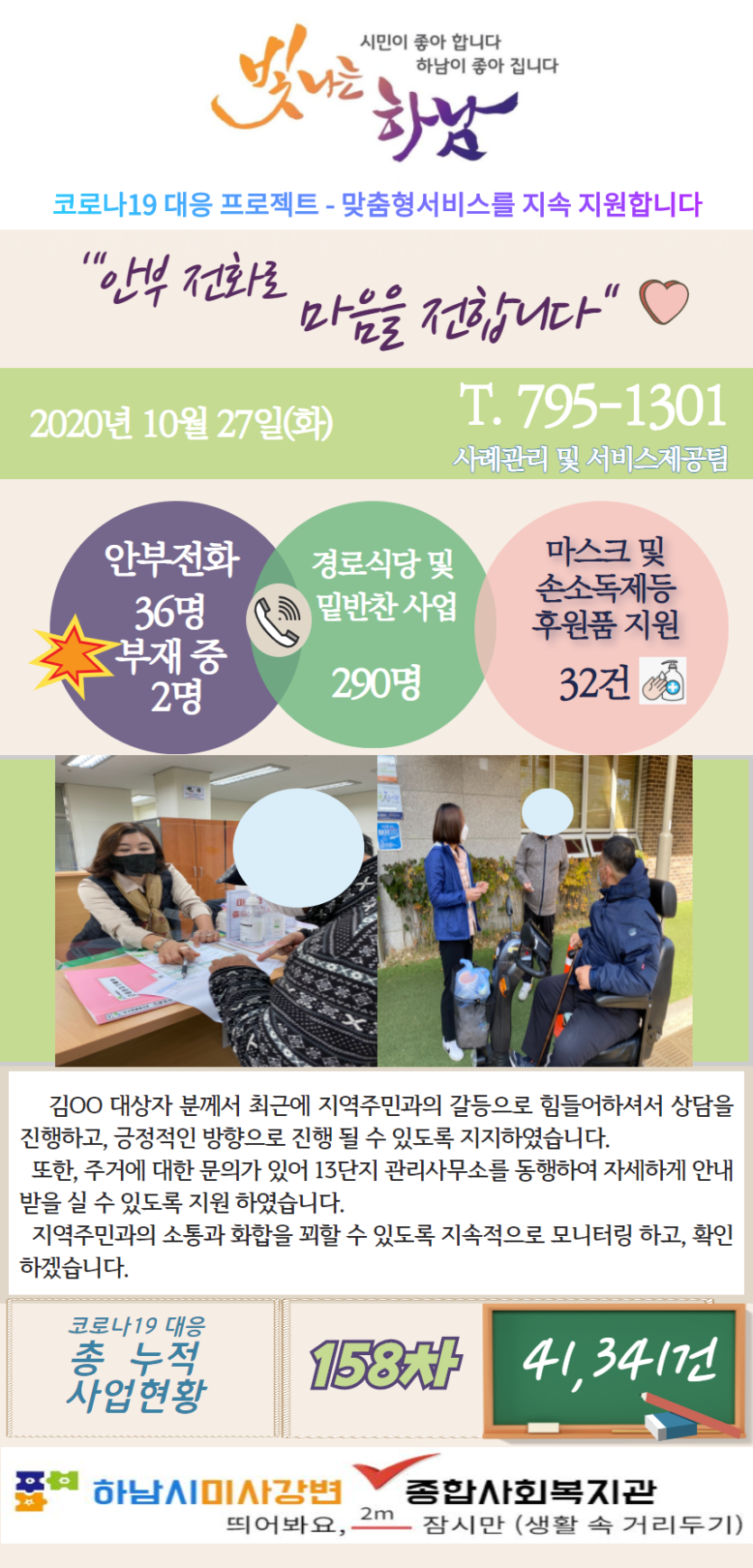 10월 27일 코로나19 극복! 안부전화로 마음을 전합니다. 게시글 작성정보 작성자 관리자 작성일 20-10-27 15:10 조회수 2,678 댓글수 0 목록 게시글 본문 - 첨부파일 1개 10.27.png (1,005.5K) 0회 다운로드 첨부일시 : 2020-10-27 15:10:00 이전글 나눔마켓 리뉴얼 오픈!! 20-10-27 다음글 10월 26일 코로나19 극복! 안부전화로 마음을 전합니다. 20-10-26 댓글 0 등록된 댓글이 없습니다. 목록