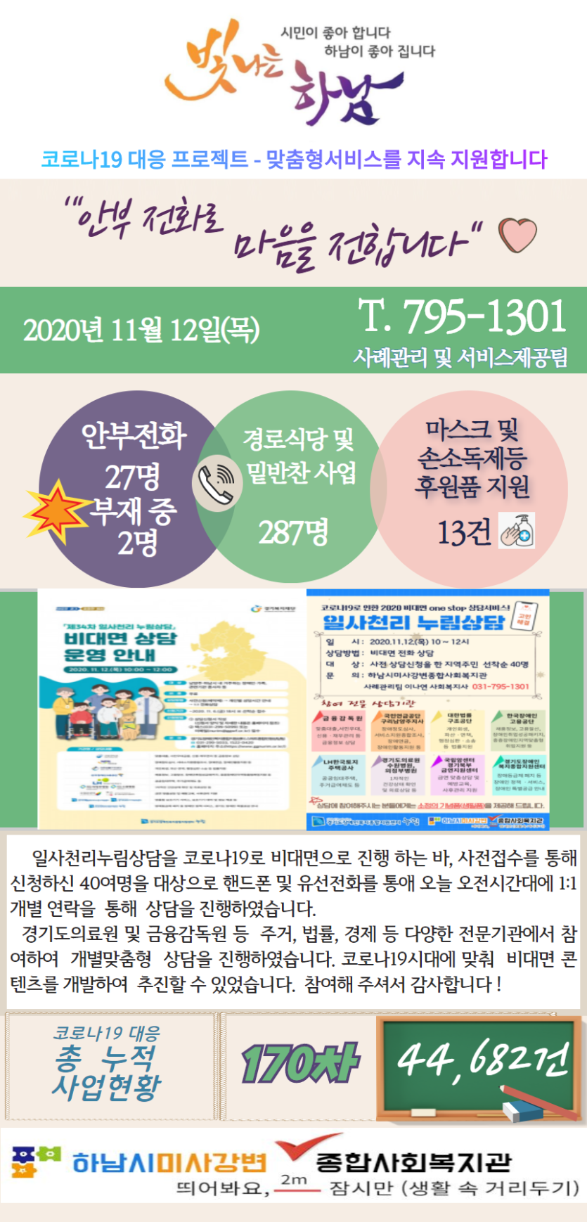 11월 12일 코로나19 극복! 안부전화로 마음을 전합니다. 게시글 작성정보 작성자 관리자 작성일 20-11-12 13:35 조회수 2,650 댓글수 0 목록 게시글 본문 - 첨부파일 1개 11.12.png (692.8K) 0회 다운로드 첨부일시 : 2020-11-12 13:35:00 이전글 11월 13일 코로나19 극복! 안부전화로 마음을 전합니다. 20-11-13 다음글 11월 11일 코로나19 극복! 안부전화로 마음을 전합니다. 20-11-11 댓글 0 등록된 댓글이 없습니다. 목록