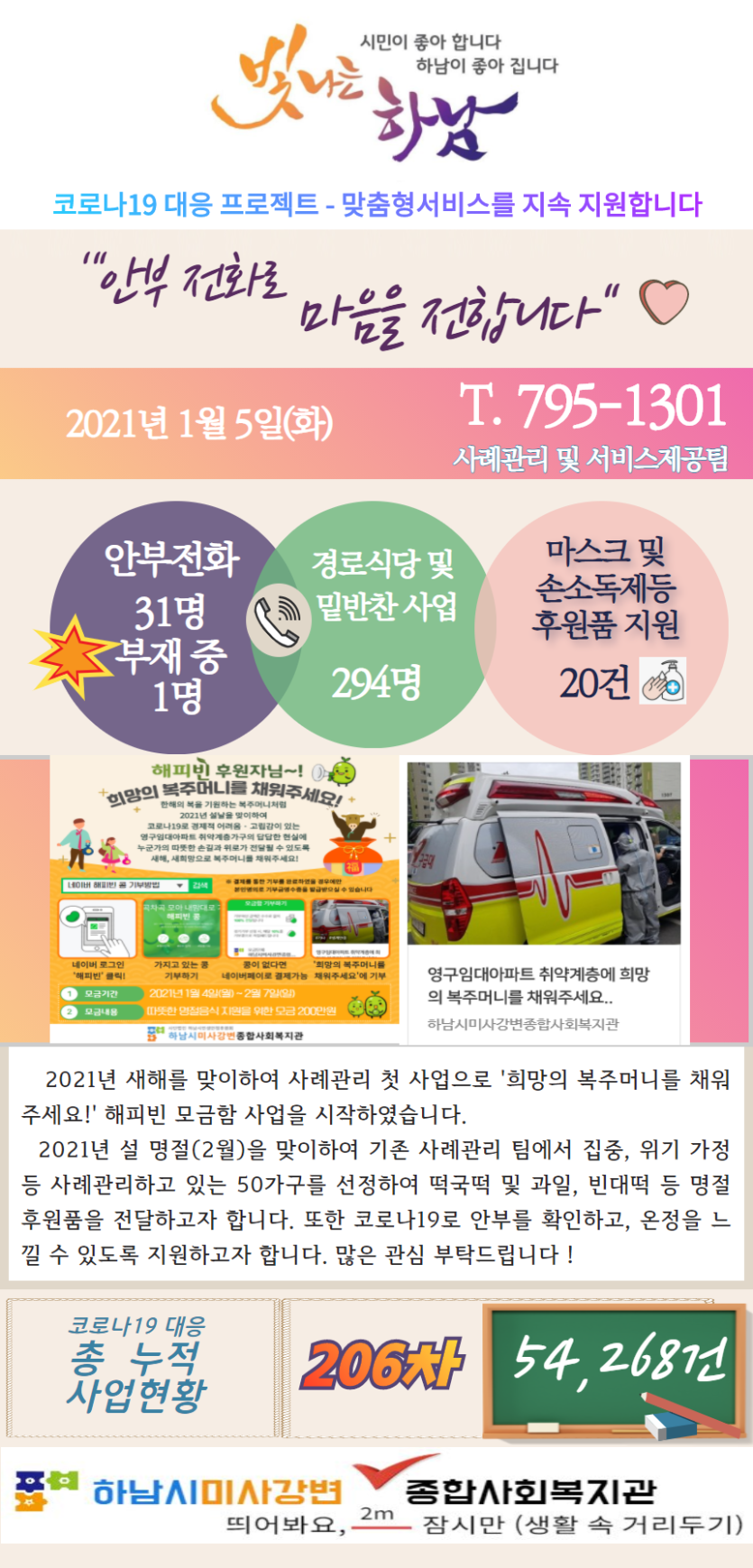1월 5일 코로나19 극복! 안부전화로 마음을 전합니다. 게시글 작성정보 작성자 관리자 작성일 21-01-05 15:10 조회수 2,666 댓글수 0 목록 게시글 본문 - 첨부파일 1개 1.5.png (761.8K) 1회 다운로드 첨부일시 : 2021-01-05 15:10:00 이전글 1월 6일 코로나19 극복! 안부전화로 마음을 전합니다. 21-01-06 다음글 2021년 복지관 시무식 21-01-04 댓글 0 등록된 댓글이 없습니다. 목록