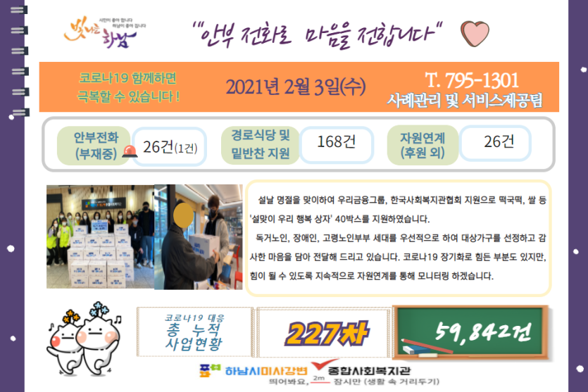 2월 3일 코로나19 극복! 안부전화로 마음을 전합니다. 게시글 작성정보 작성자 관리자 작성일 21-02-03 17:46 조회수 2,650 댓글수 0 목록 게시글 본문 - 첨부파일 1개 2.3.png (322.0K) 0회 다운로드 첨부일시 : 2021-02-03 17:46:00 이전글 2월 4일 코로나19 극복! 안부전화로 마음을 전합니다. 21-02-04 다음글 2월 2일 코로나19 극복! 안부전화로 마음을 전합니다. 21-02-02 댓글 0 등록된 댓글이 없습니다. 목록