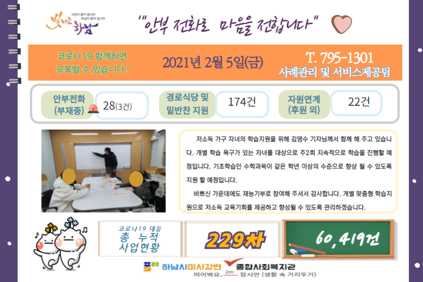 2월 5일 코로나19 극복! 안부전화로 마음을 전합니다. 게시글 작성정보 작성자 관리자 작성일 21-02-05 17:46 조회수 2,674 댓글수 0 목록 게시글 본문 - 첨부파일 1개 2.5.png (284.7K) 1회 다운로드 첨부일시 : 2021-02-05 17:46:00 이전글 2021 한국수자원공사와 함께하는 「나만의 수호천사」 맞춤형 복지서비스 21-02-08 다음글 2월 4일 코로나19 극복! 안부전화로 마음을 전합니다. 21-02-04 댓글 0 등록된 댓글이 없습니다. 목록