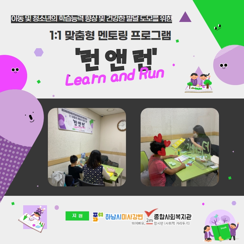 1:1 맞춤형 멘토링 프로그램 ‘런(Learn) 앤(and) 런(Run)’ 사업은 코로나19로 인한 결손을 극복하고, 건전한 심신 발달에 따른 학교생활 적응력을 향상시켜 건강한 사회구성원으로서의 성장을 돕고자 하며, 코로나19 거리두기 단계에 따라 방역수칙을 철저히 하여 안전하게 매주 2회의 멘토, 멘티가 만나 활동을 진행하고 있습니다.
