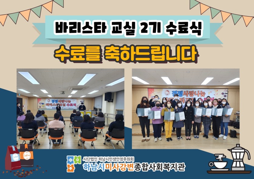 경력단절 지역주민 분들의 재취업 및 창업에 목적을 두고 사업 진행한 만큼 저희 복지관에서 진행한 바리스타교실 사업을 통해 수강생 분들께서 좋은 결과 거두시길 바라며, 앞으로 꽃길이 가득하시길 바랍니다.