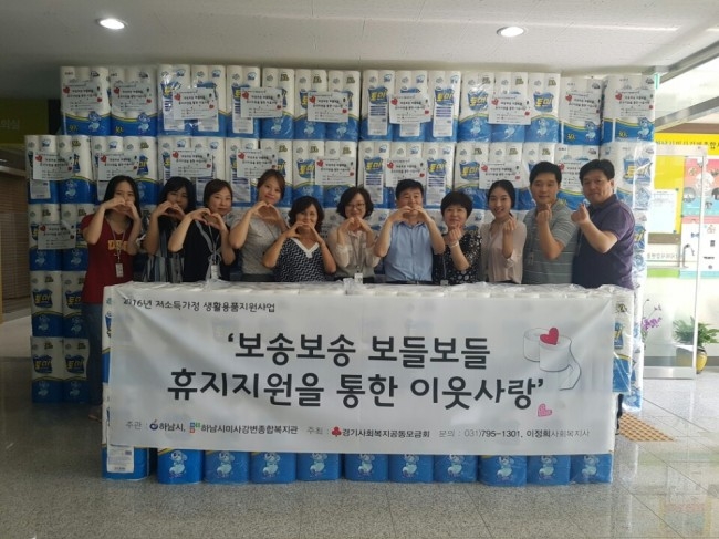 하남시와 하남시미사강변종합사회복지관(관장 조혜연)이 주관하고 경기사회복지공동모금회이주최한 ‘보송보송 보들보들 휴지지원을 통한 이웃 사랑’ 생활용품 전달식이 진행됐다.
