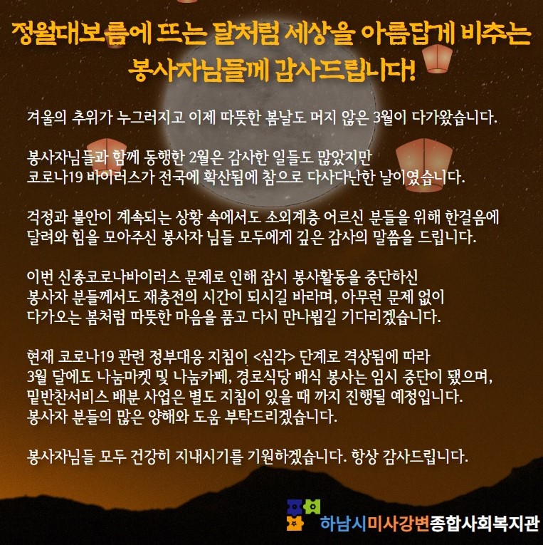 자원봉사자 2월 감사편지 게시글 작성정보 작성자 관리자 작성일 20-02-28 13:00 조회수 1,444 댓글수 0 목록 게시글 본문 하남시미사강변종합사회복지관 올림 첨부파일 1개 2월 감사문자.jpg (248.8K) 0회 다운로드 첨부일시 : 2020-02-28 13:00:00 이전글 후원자 2월 감사편지 20-02-28 다음글 후원자 1월 감사편지 20-01-31 댓글 0 등록된 댓글이 없습니다. 목록